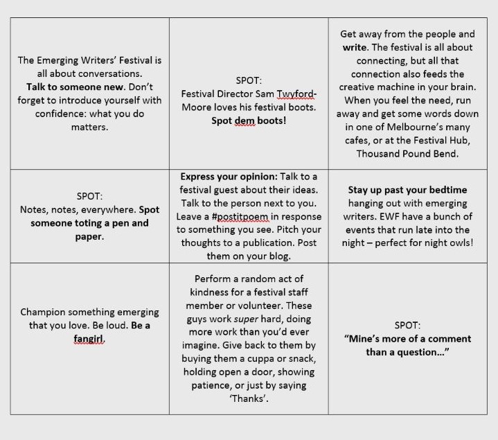 So, naturally, I’ve made a bingo game. The table below lists a number of things that you might see or experience at the festival. From silly things (hai, STM boots!) to ones that can potentially really improve your festival experience (connecting with new people), the aim is to cross off all these squares until you’ve completed the grid. Mostly, it includes things I’ll be happy to see, along with things that I hope will challenge me a bit. I’ll be playing, and documenting my festival experience through Twitter.